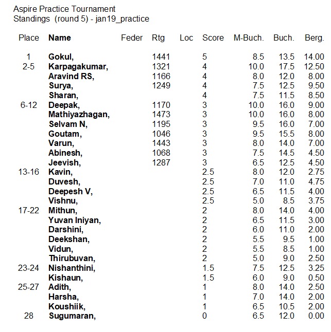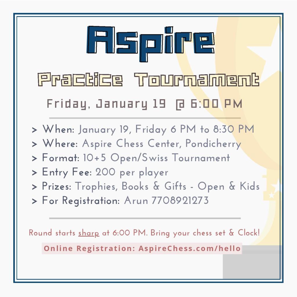 Aspire Chess Center, Pondicherry conducts Rapid 10+5 practice tournament this Friday, January 19.