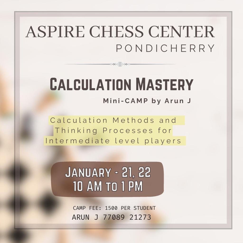 Aspire Chess Center conducts mini-camp on January 21 & 22, between 10 AM and 1 PM in the morning. Interested players/parents can contact Arun 7708921273