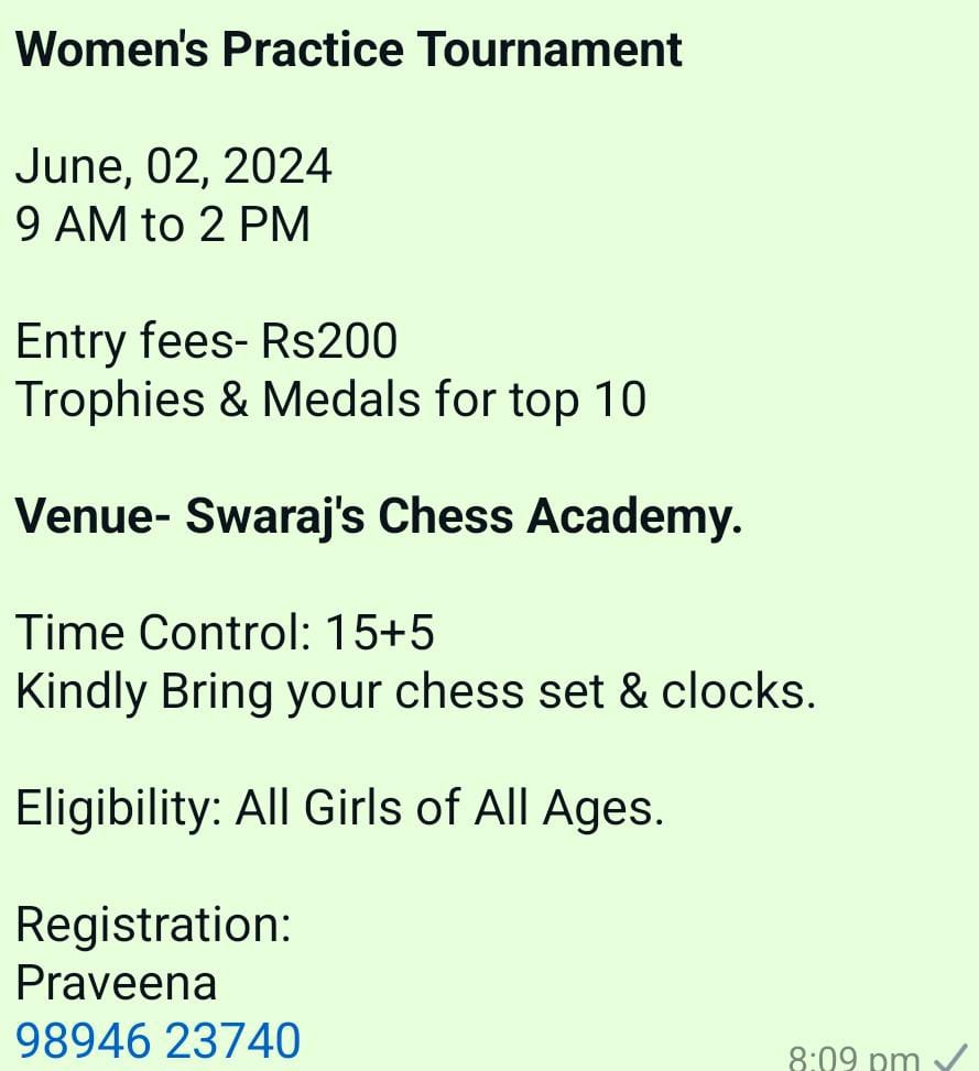 ☑ June 2, 2024 – Women’s Practice Tournament – Swaraj’s Chess Academy