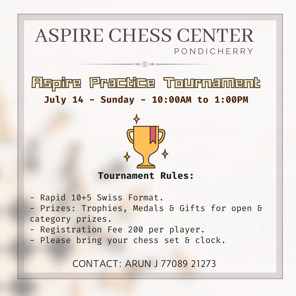☑ JULY 14, Sunday – Aspire Practice Tournament – 10 AM to 1 PM