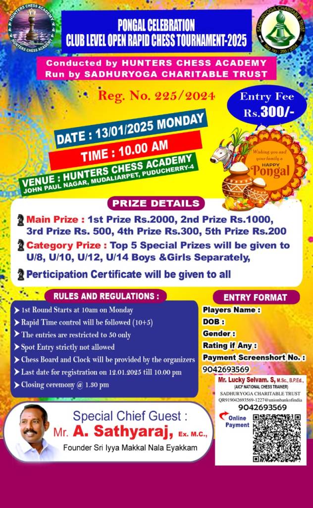 ☑ January 13, Monday – Hunter Pongal Celebration Open Rapid with Cash prizes