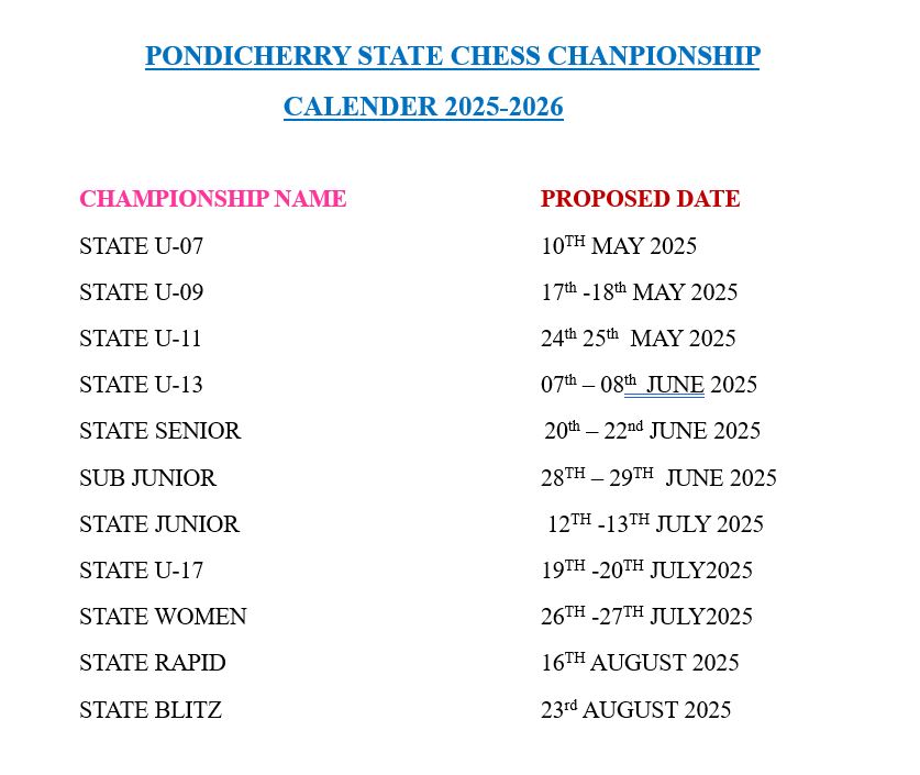 ☑ Pondicherry State Chess Championship Calendar 2025 – 2026