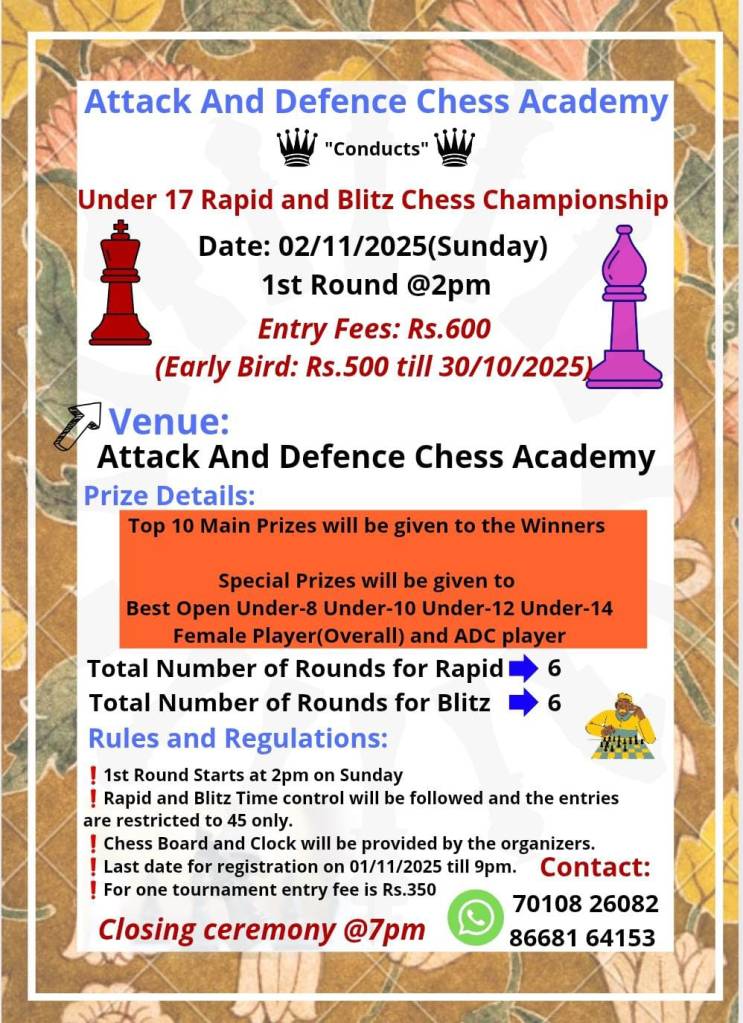 ☑ November 02, Sunday – Attack and Defence U17 Rapid and Blitz Chess Championship – 2 PM onwards